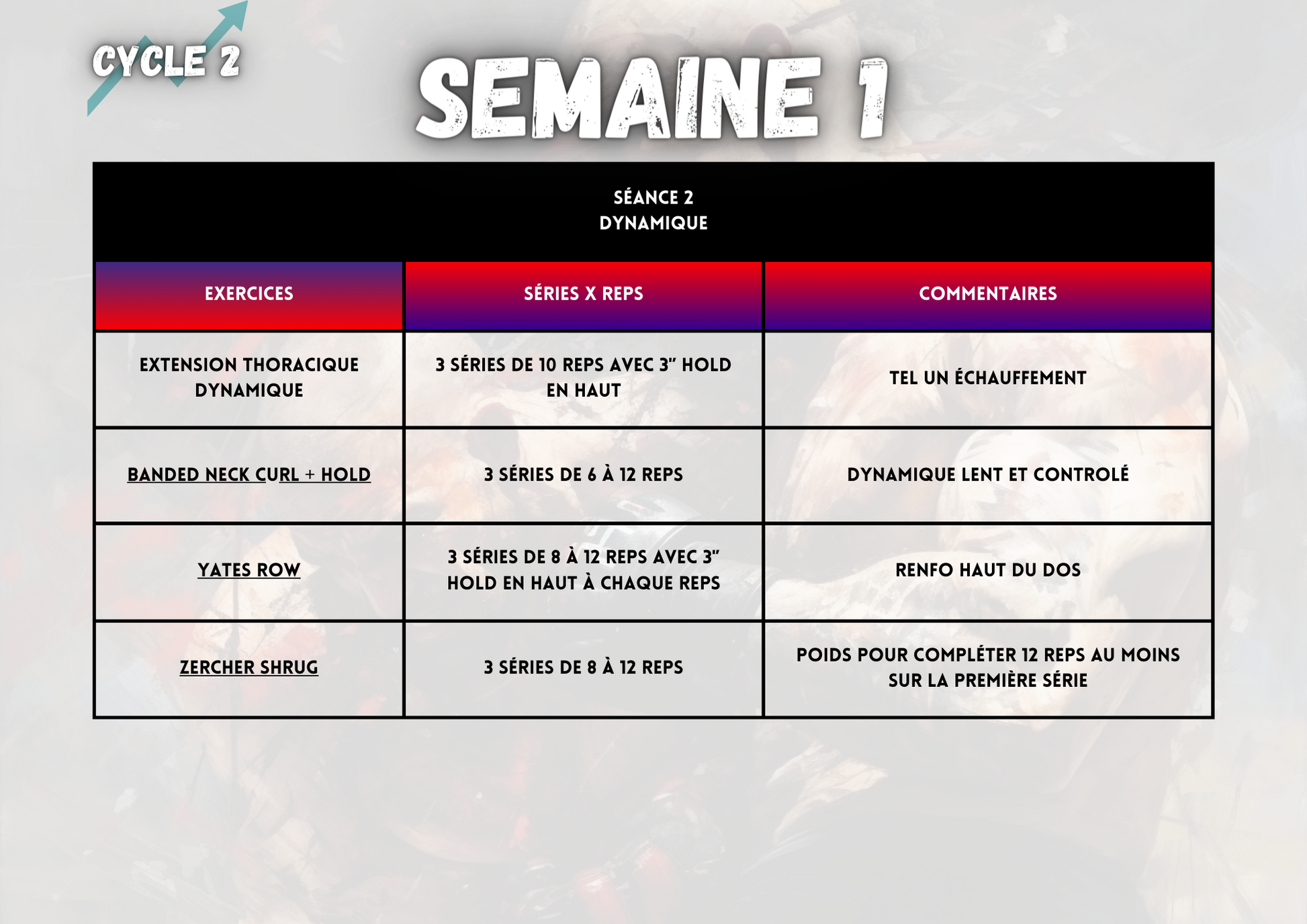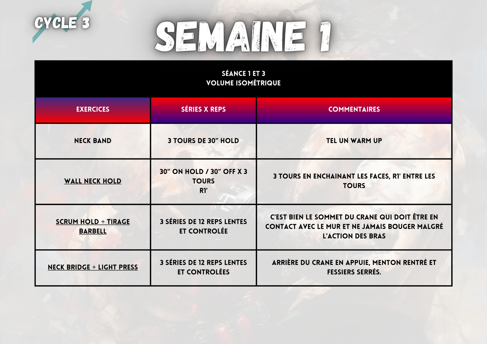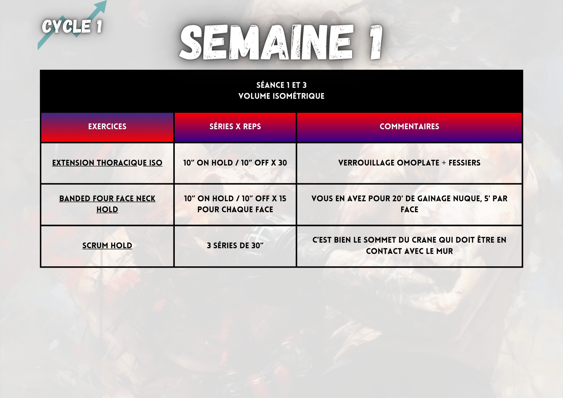 Programme de 9 semaines. 3 sessions (dont 2 identiques). Passage de l'isométrie au dynamique, combinaison des deux. Ce programme est faisable avec le matériel de base d'une salle de musculation. Réalisable facilement à domicile.