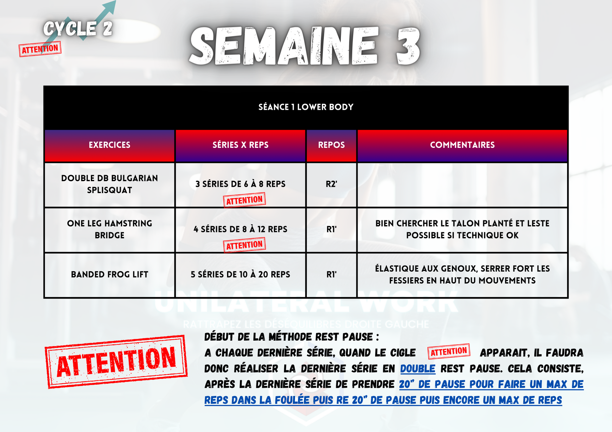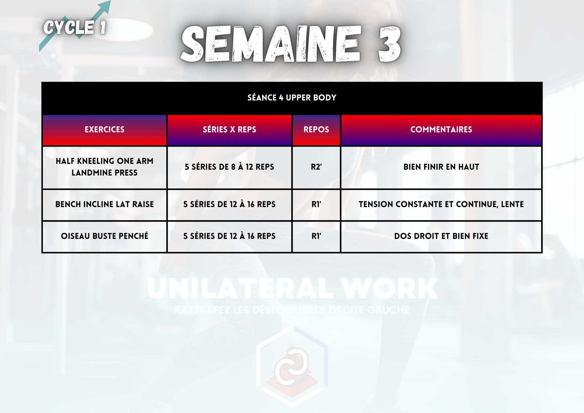 Vous y trouverez trois cycles de trois semaines. Il se compose d'une séance bas du corps, d'une séance haut du corps, une séance core et une deuxième séance haut du corps.