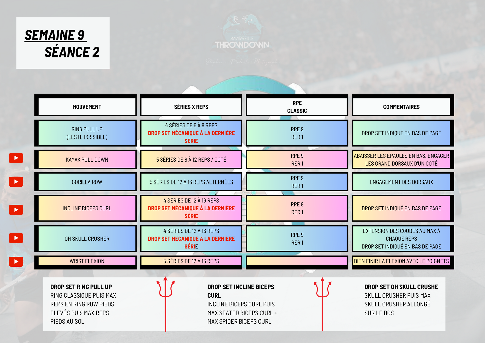 Ce programme de 9 semaines est essentiellement basé sur des exercices permettant de développer la force et la masse musculaire du haut du dos. Il contient bien évidemment beaucoup d'exercices de tirage ou "Row" en tout genre, avec plein de modalités différentes.