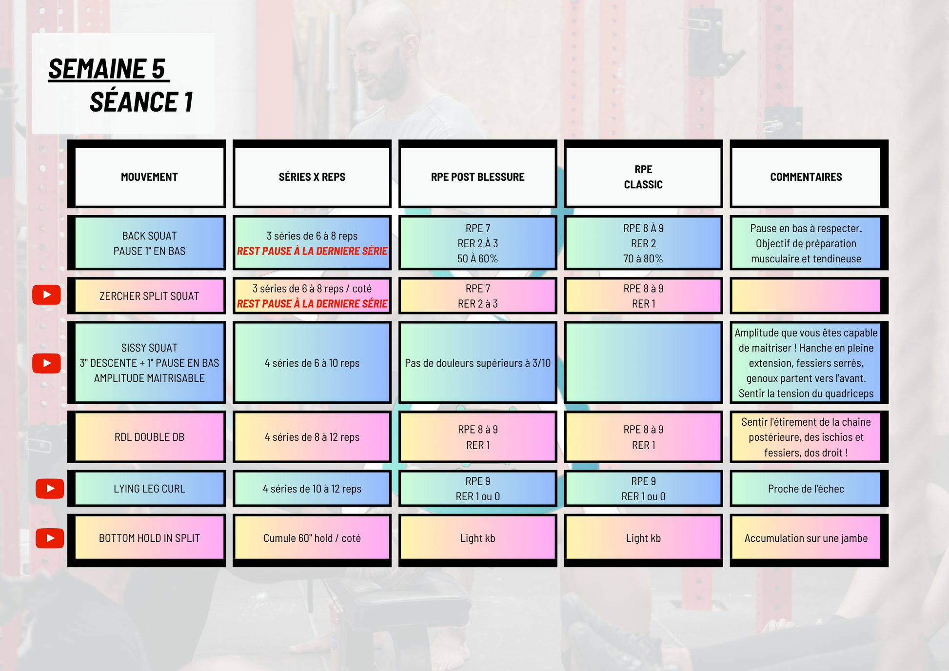 Ce programme de 9 semaines est essentiellement basé sur des exercices permettant de développer la force et la masse musculaire des jambes. Il convient notamment à toutes personnes en reprise de travail en flexion de jambes. Vous y trouverez des mouvements poly articulaires et isolés. Le double rpe, RPE de reprise et RPE de "performance", vous permettra d'utiliser deux fois cette programmation ! En effet ces deux RPE étant différents, la progressivité, fondamentale pour progresser, est respectée.